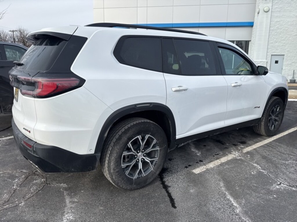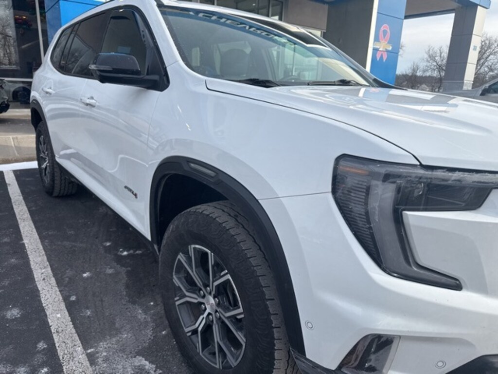 Certified. Summit White 2024 GMC Acadia AT4 AWD 8-Speed Automatic 2.5L DOHC AWD, Forest Storm W/Mahogany Accents Cloth.