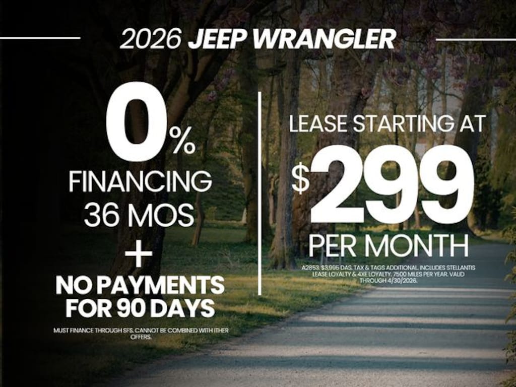 If youre researching a Jeep Wrangler lease or exploring low financing, our team provides straightforward comparisons so you can choose the right payment structure. We regularly assist shoppers looking for Jeep Wrangler deals or a new Jeep Wrangler near me, including drivers from Flemington, Hackettstown, Budd Lake, Bridgewater, and Easton, PA. Many customers compare inventory across the region before choosing our Washington, New Jersey dealership for transparent pricing and real availability. If youre searching for a 2026 Jeep Wrangler for sale in Northwest New Jersey, Stock #A2821 offers Willys styling, 4WD capability, and trusted local support at Rossi CDJR.